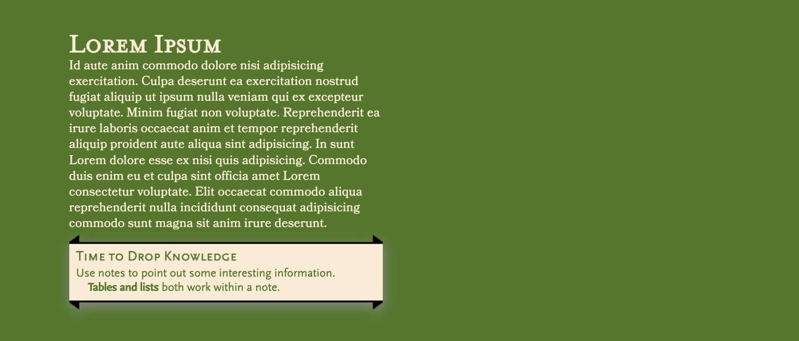 Style Editor / CSSNote here that I need to specifically target the paragraphs inside notes because the PHB default theme has that already set, and I need to override it. But I’m also taking the opportunity to use calc(), a rare math function in CSS. Using calc, I am setting the line-height of the note text to always be 70% of the normal line-height.