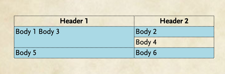 MarkdownThe cell “Body 3” will be merged up into “Body 1” and the text in the final cell will be “Body 1 Body 3”. With some extra styling for clarity, the result: