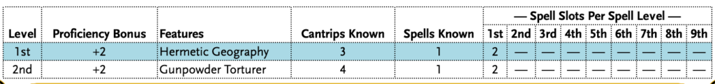 | 1st | +2 | Hermetic Geography | 3 | 1 | 2 | — | — | — | — | — | — | — | — |